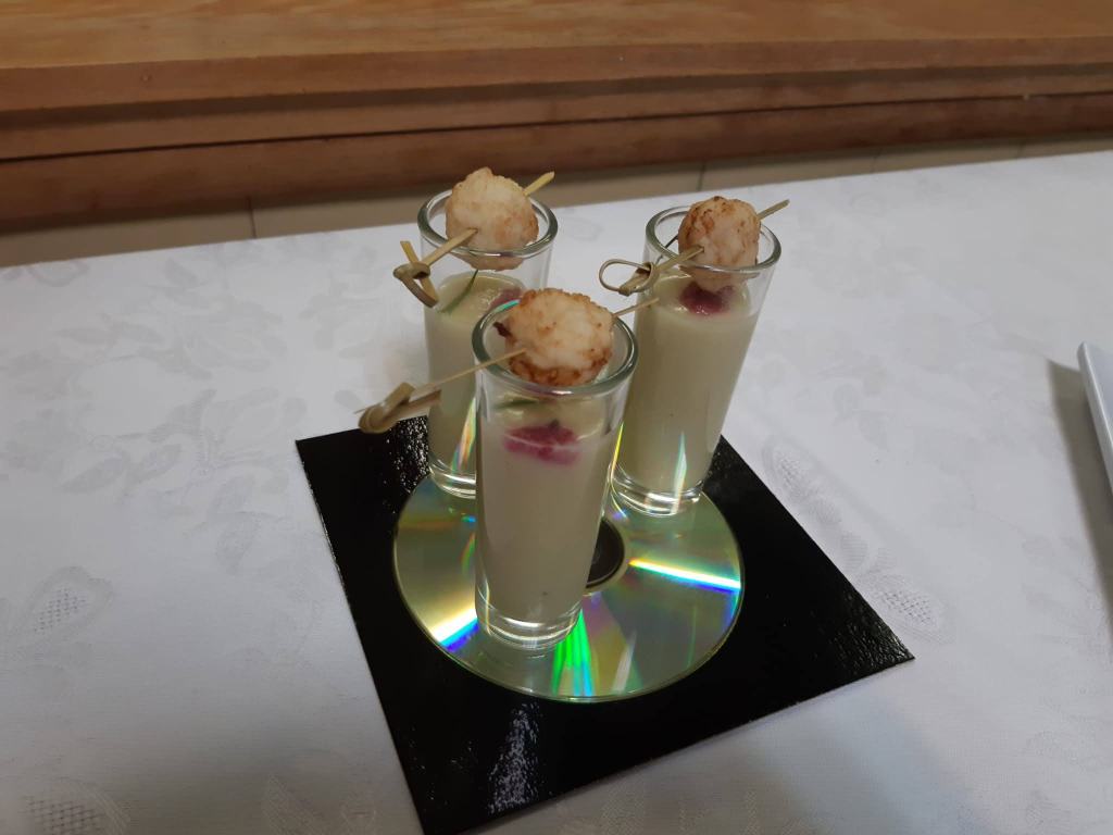 Montamos el aperitivo en un vasito, la crema por encima los piñones y la butifarra.
